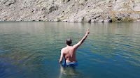 Una vez llegamos a la Laguna Cimera procedemos a realizar una pausa en el recorrido, disfrutando del entorno de Cinco Lagunas, recuperando energías con unos bocadillos y dándonos un buen baño para recuperar el tono muscular.